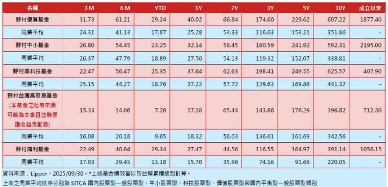 上述基金均經金管會核准或同意生效,惟不表示絕無風險。基金經理公司以往之經理績效不保證基金之最低投資收益;基金經理公司除盡善良管理人之注意義務外,不負責本基金之盈虧,亦不保證最低之收益,投資人申購前應詳閱基金公開說明書 (或投資人須知)。有關基金應負擔之費用 (境外基金含分銷費用) 已揭露於基金公開說明書或投資人須知中,本公司及銷售機構均備有基金公開說明書 (或其中譯本) 或投資人須知,投資人亦可至基金資訊觀測站或本公司網站 (https://www.nomurafunds.com.tw) 中查詢。基金買賣係以投資人自己之判斷為之,投資人應瞭解並承擔交易可能產生之損益,且最大可能損失達原始投資金額。基金不受存款保險、保險安定基金或其他相關保障機制之保障。如因基金交易所生紛爭, 台端應先向本公司申訴,如不接受前開申訴處理結果或本公司未在三十日內處理時,得在六十日內向金融消費評議中心申請評議。 台端亦得向投信投顧公會申訴、向證券投資人及期貨交易人保護中心申請調處或向法院起訴。基金投資風險包括但不限於類股過度集中之風險、產業景氣循環之風險、流動性風險、外匯管制及匯率變動風險、投資地區政治、社會或經濟變動之風險、商品交易對手之信用風險、與其他投資風險等,請詳見基金公開說明書 (投資人須知)。基金可能投資承銷股票,其可能風險為曝露於時間落差之風險,即繳款之後到股票掛牌上市上櫃之前的風險。【野村投信獨立經營管理】