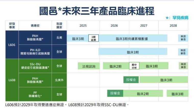 L608 的潛在適應症除硬皮症外,也包括肺纖維化與肺高壓疾病,全球市場規模預計將超過 70 億美元。由於該藥屬於罕見疾病(孤兒藥)範疇,價格較高、競爭者少。甘霈指出:「孤兒藥價值在於人數雖少,但治療需求明確、保險公司給付意願高,獲利空間極大。」目前已與潛在國際藥廠的合作洽談中,預計明年有機會完成授權,為國邑 * 開啟第二條高價值授權曲線。