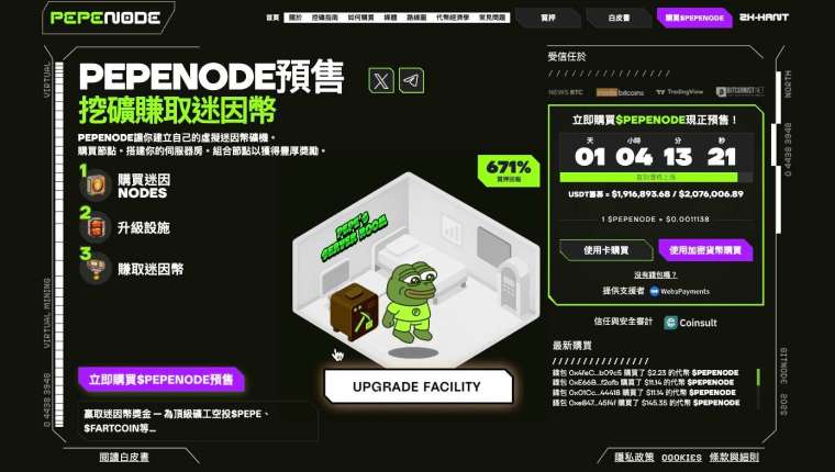 除了挖礦與收益功能,Pepenode 還計畫整合遊戲化競賽與 NFT 機制,讓玩家能以節點作為資產在虛擬世界中互動。這使該代幣的價值不僅存在於價格漲幅,更來自持續參與所帶來的經濟循環。隨著更多用戶加入,Pepenode 可能成為 2025 年最具互動性的迷因經濟體,讓傳統「投機型迷因幣」邁向實用與娛樂兼備的新階段。