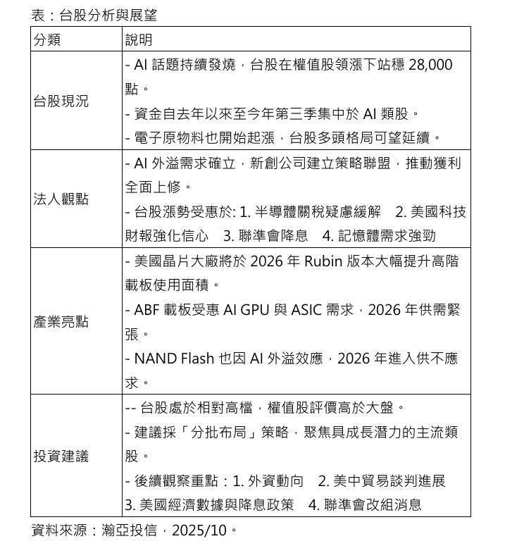 法人進一步表示,今年下半年台股漲勢凌厲,主要受惠於半導體關稅疑慮緩解、美國科技財報強化市場對 AI 投資的信心、聯準會降息政策,以及記憶體需求強勁等多重利多因素。
