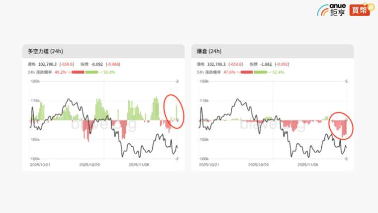 雖然目前就數據面來看,比特幣還未全面轉強,但是爆倉地圖顯示交易員以看多為主,且多空力道顯示近期有較多主動買盤,受消息影響的買盤明顯,反映交易員持續博弈多單,值得注意的是,從「爆倉 (24h)」模組觀察,過去兩日多方連續爆倉,顯示市場進入止跌前的慣性清算區間,需關注是否進入反手反彈階段。
