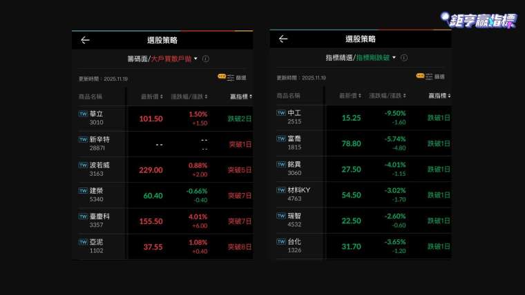 現階段想先入袋為安的保守投資人,可觀察《鉅亨贏指標》中選股策略的「指標剛跌破」,注意手中持股是否出現跌破「強弱關鍵」,考慮轉空操作;較積極的投資人則可參考「大戶買散戶拋」。