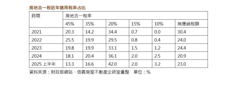 統計資料顯示,今年上半年房地合一稅率 45% 剩下 13.3%,低於去年全年的 18.1% 與 2023 年 19.8%,35% 稅率今年上半年則是 16.6%,低於去年全年的 20.4%,顯示持有 5 年內的短期交易減少,至於持有滿 5 年 20% 稅率,上半年則是高達 41.98%,遠高於去年的 36.1% 與 2023 全年的 33.1%,反映出持有滿 5 年的比例快速攀升。