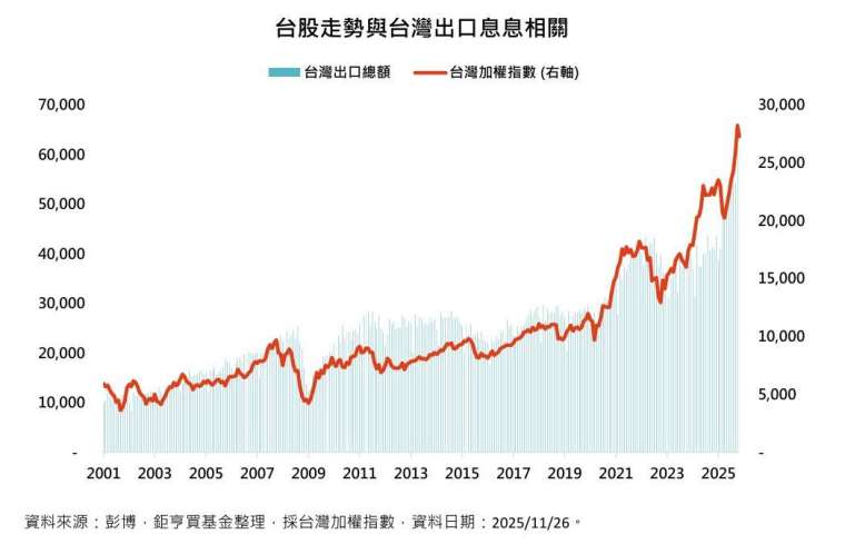 如果說產業結構決定台灣加權指數的性格,那麼出口便是觀察它景氣的最佳捷徑。台股長期走勢與台灣出口幾乎同步,無論是疫情後電子需求爆發,或景氣循環下行時的出口疲弱,台股都呈現緊密的跟隨關係。原因非常簡單:台灣的出口有超過八成來自電機與機械相關,而晶圓代工的全球市佔率更接近八成。全球科技投資需求的擴張或收縮,會立即反映在出口表現上,也自然成為台股漲跌的重要訊號。