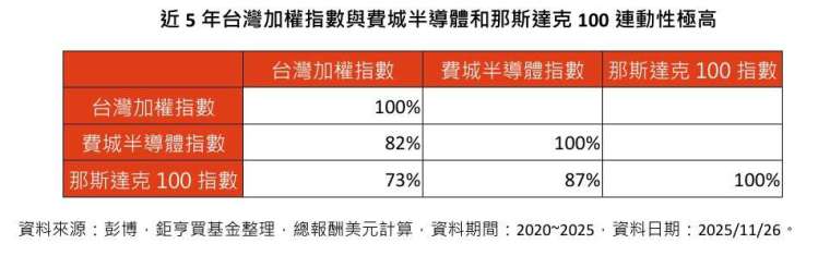 進入 AI 時代後,這個連動性不僅加深,更擴大到與國際股市之間的關係。從資料中心到高效能運算,再到模型訓練設備與各式零組件,全球科技巨頭的資本支出持續提高,而台灣正是供應鏈中不可或缺的一環。這讓台股與美國科技相關指數的連動度更高,尤其是費城半導體指數與那斯達克指數,與台股的相關性分別達到 82% 與 73%,顯示全球科技投資的節奏,幾乎能同步牽動台灣加權指數的走勢。