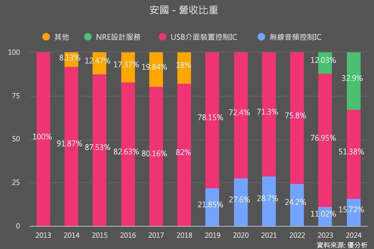 在財務數據上也有明確變化:2024 年,安國來自 NRE(委託設計收入)的比重已高達 32.9%,遠高於前幾年的 12%。這意味著,即使實際出貨還沒爆量,只要專案設計階段達成、完成驗證,公司就能提前認列營收。這正是營收創新高的主因。