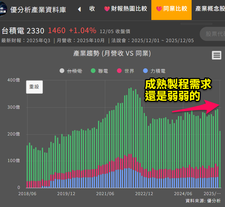 你會發現,目前還是只有先進製程在好,成熟製程就溫溫的,沒有明顯的復甦。復甦力道如果不夠強,還就無法像『中國』那次一樣強勁成長。