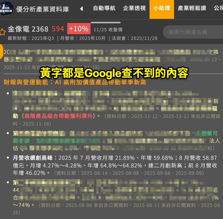 這是一套專業級的系統,裡面包含你理解市場所需要的全部資料,例如法人預估值、台股法說會逐字稿、Google查不到的接案進度、Google查不到的公司最新動態、折現估值模型.....等。