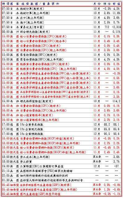 隨後義大利數據顯示 11 月消費者物價較前月降 0.2% 及較去年同期放緩至 1.1%,並據 S&P 全球編製的 12 月 HCOB 綜合 PMI 初值調查,法國、德國與歐元區分別下滑至 50.1、51.5 及 51.9,但美國數據普遍疲弱打壓美元,推升歐元兌美元至 1.1803 高點。隨著德國經濟研究機構 ZEW 表示,德國投資者信心 12 月升至正 45.8 超預期,但歐元區從 10 月未經季節調整貿易順差縮減至 184 億歐元,而且市場關注歐洲央行 (ECB) 週四利率決定,推低歐元兌美元至 1.1743 低點。預估今日歐元兌美元阻力於 1.1760-80,支撐於 1.1670-90。