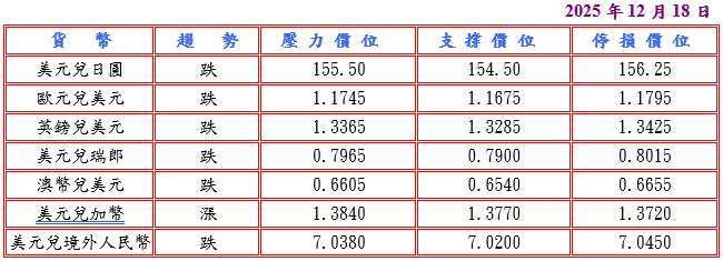 隨後歐盟統計局稱,歐元區 11 月消費者物價調和指數 (HICP) 較前月跌 0.3% 及較上年同期漲 2.1% 低於預期,但法國國家統計與經濟研究所(INSEE)報告今年最後一個季經濟增長率放緩至 0.2%,但得益於外貿特別強勁,第三季增長率為 0.5%,並預測經濟將在 2026 年初實現溫和增長,而且市場預計歐洲央行 (ECB) 週四會議將維持利率不變,推升歐元兌美元至 1.1758 高點。預估今日歐元兌美元阻力於 1.1745-65,支撐於 1.1660-80。