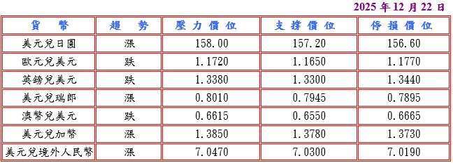 隨著 BOJ 如預期上調短期利率 25 個基點至三十年高位 0.75%,並稱若經濟發展和物價預測得以實現將繼續加息,亦基本維持整體經濟的展望,激勵日本十年期公債收益率升至 1999 年以來新高,但 BOJ 總裁植田和男在新聞布會上對未來加息時機和步伐含糊其辭,並據日本政府月度報告稱去年追加預算帶來的增長勢頭已減弱,十三個月來首次下調公共投資的看法,引發日圓遭拋售,縱使日本財務大臣片山皋月警告日圓在 BOJ 加息後仍大幅下跌,將採取適當措施應對過度匯率波動,而且美國 11 月成屋銷售較前月增 0.5% 至 413 萬戶不及預期及密西根大學 12 月美國消費者信心指數終值為 52.9 低於預估和初值,但紐約聯邦儲備銀行總裁威廉姆斯認為美國聯邦準備理事會 (FED) 不存在進一步降息的緊迫性,推升美元兌日圓至 157.75 高點。預估今日美元兌日圓支撐於 157.00-20,阻力於 158.00-20。