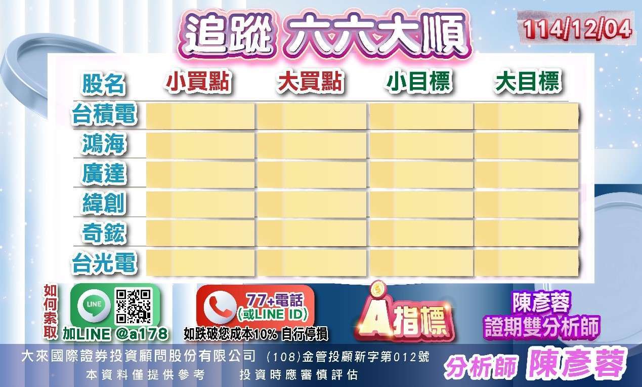 大來投顧陳彥蓉指出,美股受 9 月 PCE 年增低於預期,強化本週降息依據,資金推升有再創高機會。台股受外資轉買,11 月電子股營收持續受惠 AI 需求,基本面及籌碼面加持有再創高時候。上週轉進記憶體、玻纖布族群又再度大賺!台股漲多不追,但震盪時低價起漲股已經鎖定,操作一檔接一檔,翻倍財富為夢想再拚!再次布局,先賺再說專案登記。