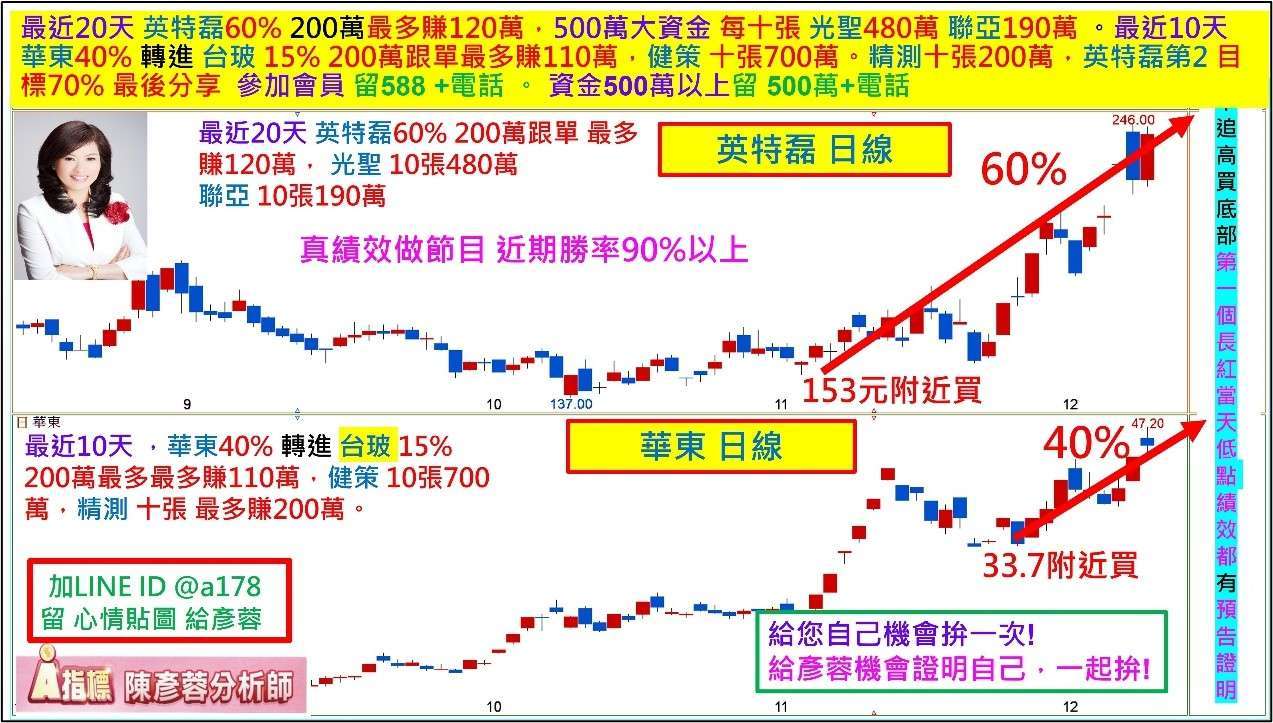 彥蓉做節目以真績效做節目,最近帶會員與留電話粉絲,最近 20 天 英特磊 60% 200 萬跟單 最多賺 120 萬, 光聖 10 張 480 萬,聯亞 10 張 190 萬。最近 10 天 ,華東 40% 轉進 台玻 15% 200 萬最多最多賺 110 萬,健策 10 張 700 萬,精測 十張 最多賺 200 萬。 (真績效做節目 最近勝率 90% 以上) (過去績效不保證未來)。