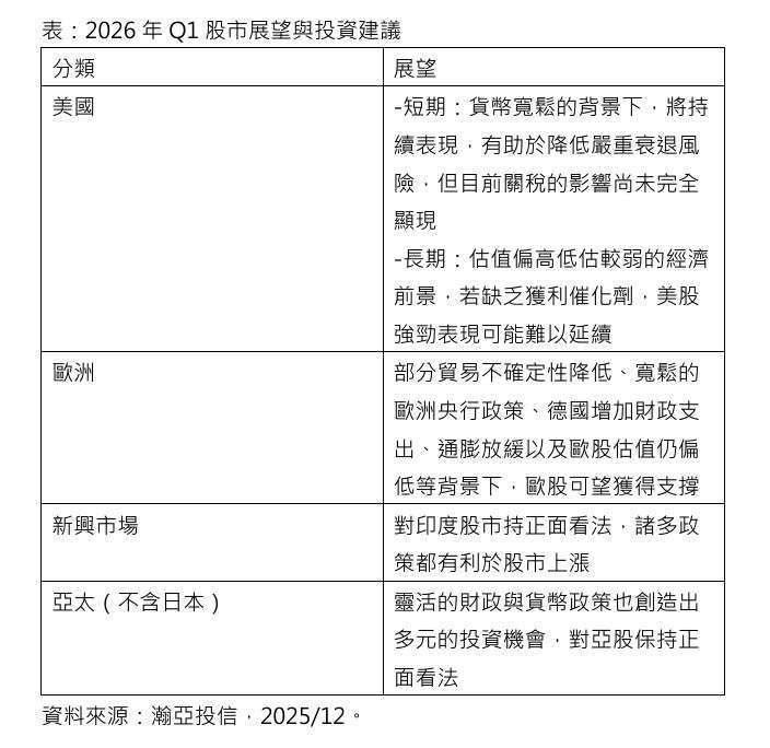 瀚亞投信投資長林如惠表示,美國經濟成長在 2026 年將放緩,且通膨具有黏著性,這將持續支撐亞洲市場的優異表現。亞洲靈活的財政與貨幣政策也創造出多元投資機會。由於美國資產估值偏高,資產配置策略可採取多元分散,除了配置美股,也建議將部分資產分配至優質亞洲資產。