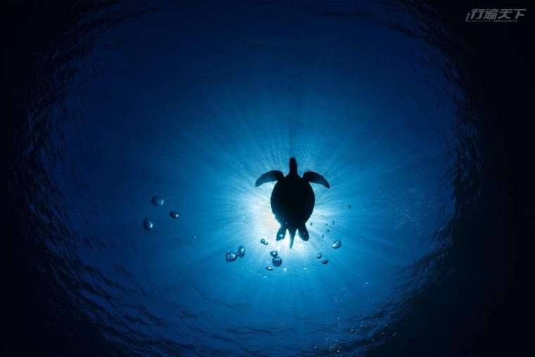 01▲當海龜上升至水面呼吸的逆光剪影,與在水下的我呼吸吐出的泡泡,組合成很美的畫面。