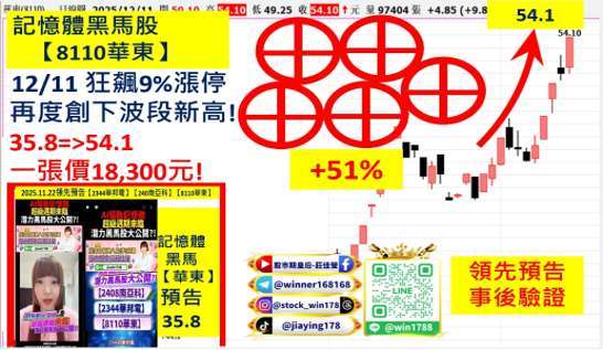 (8110-TW) 華東,35.8=>54.1,領先預告後大漲 51%,專注於 IC 封測服務,屬電子零組件產業體系,總市值逾百億元,為中型股典型代表,公司主要提供功率元件、感測元件封裝與測試,為國內晶片客戶提供垂直整合封測方案,營運方面,華東 11 月合併營收 1,187 百萬元,月增 15.1%、年增 26.9%,創近 25 個月新高,反映半導體回補庫存效應發酵,訂單持續增長,前 11 月營收合計 11,268 百萬元,年增 8.3%,顯示基本面逐季回穩,華東與 (2344-TW) 華邦電連動度高,隨其產能擴張,接單動能同步增強,今年前三季在業外助攻下已轉盈,每股純益 1.29 元,法人預期第 4 季本業改善可期,明年營運表現有望優於今年。