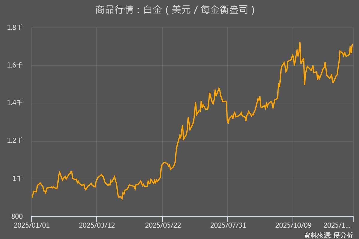 除了黃金與白銀外,白金(Platinum)與鈀金(Palladium)也表現強勢。鉑金上漲3.2%至$1,750.35;鈀金則上漲2.6%,至$1,523.10,兩者在本週均上漲。