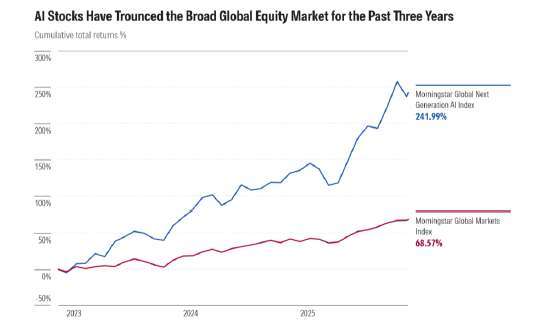 難怪 晨星全球次世代人工智慧指數(Morningstar Global Next Generation Artificial Intelligence Index) 在過去三年大漲 242%。三年是一個相當符合背景的衡量期間,因為這波 AI 大爆發正是自 2022 年底 ChatGPT 的推出所引燃。AI 的運算核心供應者 輝達(Nvidia, NVDA) 的市值也從當時的 3,390 億美元,一路飆升至今日接近 4.5 兆美元。