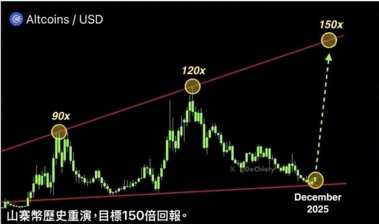圖表中標註的 90x、120x 以及預測的 150x,揭示了加密貨幣市場獨有的指數級增長屬性。這三個數字分別代表了不同週期頂部的潛在收益倍數。值得注意的是,這些頂點並非隨機分佈,而是呈現出一種階梯式上升的態勢。90 倍是過去的輝煌,120 倍是上一輪的高點,而 150 倍則是對本輪週期頂部的宏大願景。