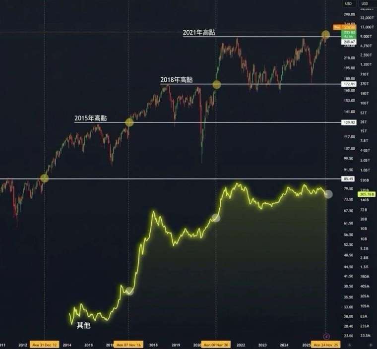 對比圖表下方的山寨幣市值(其他),目前的走勢與羅素 2,000 突破前的狀態極為相似。山寨幣市場目前仍處於一個巨大的震盪區間內,尚未出現全面爆發。根據圖中繪製的預測路徑,如果歷史規律再次應驗,羅素 2,000 的突破就是發令槍,預示著山寨幣市場即將結束洗盤,跟隨美股小盤股的步伐,開啟新一輪的主升浪。這種預期也就是幣圈常說的 Hopium(希望與沈迷的結合詞),但在這裡,它有堅實宏觀數據支持。