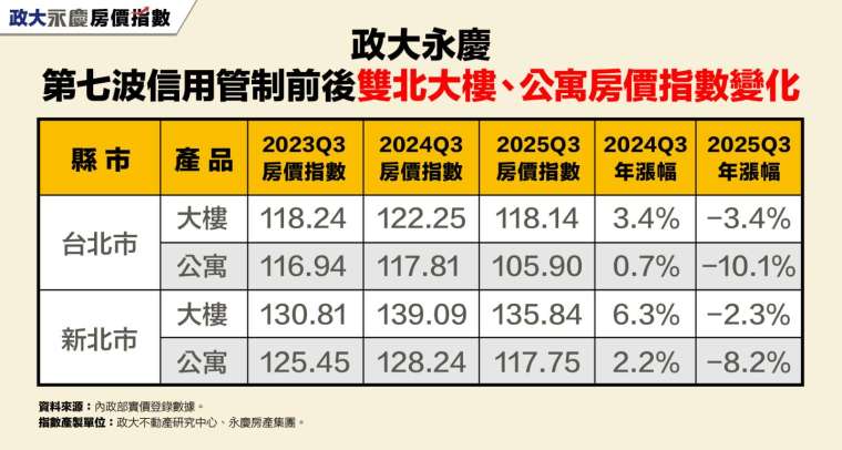 自去年 9 月 19 日央行第七波選擇性信用管制上路已滿一年,基於內政部實價登錄數據,最新「政大永慶七都大樓房價指數」和「政大永慶雙北公寓房價指數」顯示,2025 年第三季七都大樓房價指數較去年同期下跌 2.3% 至 6.7%;雙北地區公寓跌幅更深,台北市年跌 10.1%,新北市年跌 8.2%。