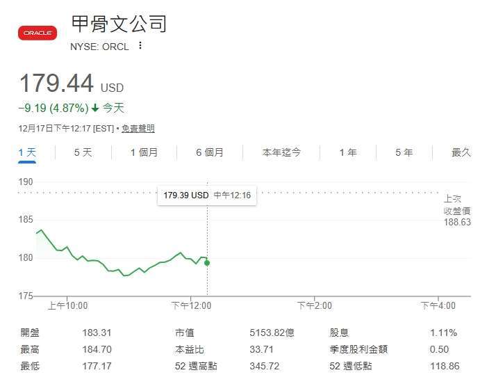 受相關消息影響,甲骨文 (ORCL-US) 股價周三在紐約盤中下跌近 5%。該股近三個月累計下跌近 40%,回吐先前因取得包括 OpenAI 在內的大型雲端運算合約而累積的部分漲幅。