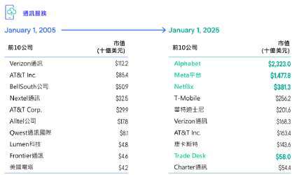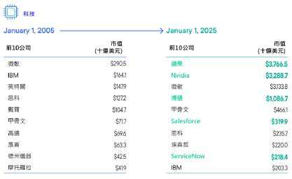 從各產業市值前十公司的變化可看出創新蓬勃發展的端倪,右側粗體字公司符合兩條件:(1) 與 2005 年 1 月相比,首次躋身前十,(2) 基於第三次或第四次工業革命的通用技術而建立。