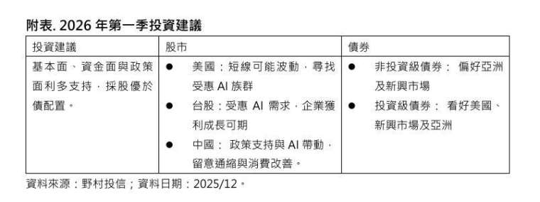 野村投信:三大利多支持 2026Q1股優於債 股市看好美國、台灣與中國,債券加碼非投資等級債