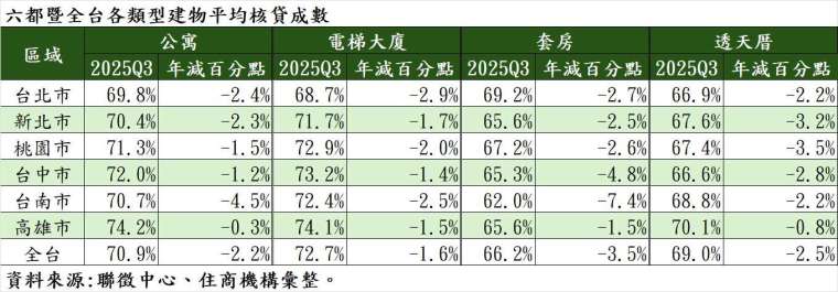 台灣央行昨 (18) 日決議仍維持第七波信用管制措施。在保持緊縮基調下,金融機構放款態度也持續謹慎。房仲觀察聯徵中心數據,全台與六都第三季平均核貸成數全面下滑,其中北市尤其爲重災區,各類建物平均核貸成數都跌破 7 成。