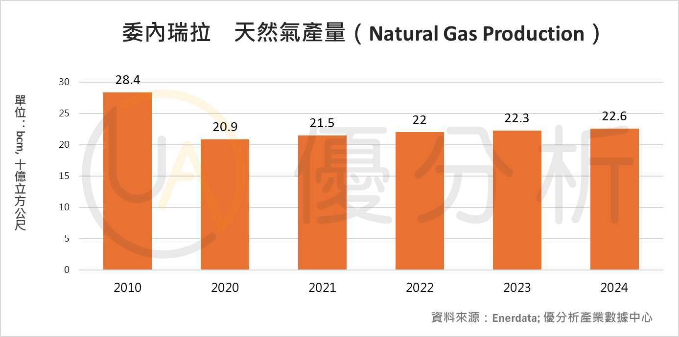 2025年12月21日(優分析/產業數據中心報導)⸺ 除了原油之外,委內瑞拉的天然氣資源同樣豐富,儲量高達 5,476 bcm(5.476兆立方公尺),為南美洲第二大、全球前十名的天然氣擁有國。然而,與石油命運相似,龐大的氣藏並未轉化為穩定的能源收益。根據市場研究機構Enerdata數據,委內瑞拉的天然氣產量自2010年以來幾乎停滯,2024年僅達 22.6 bcm(226億立方公尺),遠低於其潛在開採能力。