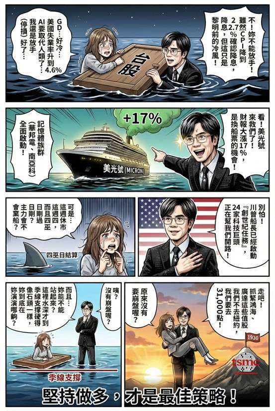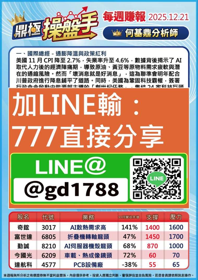 美國 11 月 CPI 降至 2.7%,雖反映失業率升至 4.6% 及 AI 替代人力的陣痛,但也確立了降息循環。配合明年期中選舉及川普新政,資金面持續有利股市中長線多頭。此外,川普啟動「創世紀任務」,集結 24 家科技巨頭全力發展 AI,產業規模持續擴大;加上美光財報亮眼帶動股價大漲 17%,為科技股注入強心針。