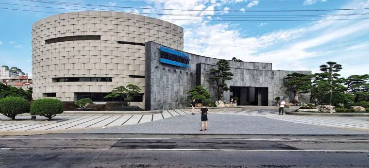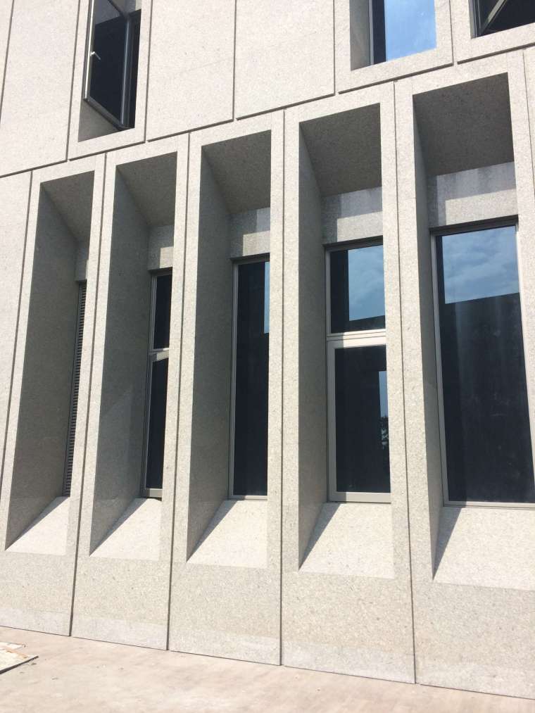 本案主材為台灣玉麒麟石,質地細膩、色澤沉穩灰中帶暖,具穩重而不沉悶的氣質。建築外牆全面採乾式施工,展現石材的雕塑語彙與工藝精度。 各立面以不同切割手法呈現層次:入口為粗鑿面與波浪面交錯,側牆搭配燒面與光面處理,窗檯則以斜切設計導引光影。石材與金屬板材相襯,形 成兼具溫度與節奏的立體構圖,展現企業精神與藝術收藏空間的雙重特質。