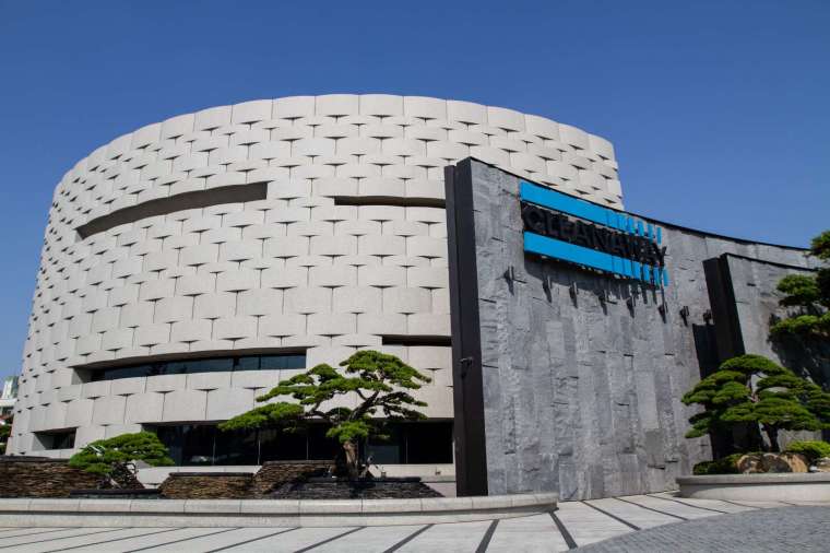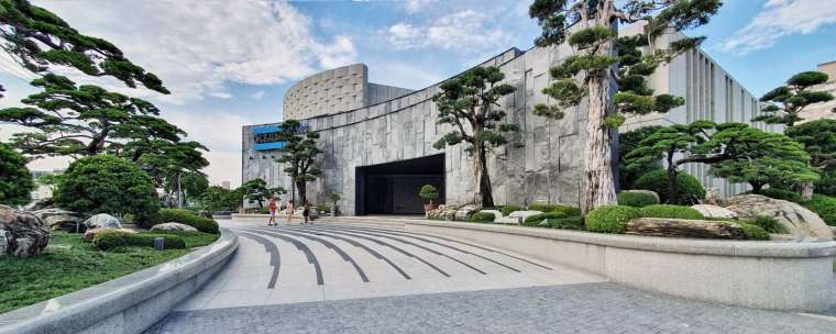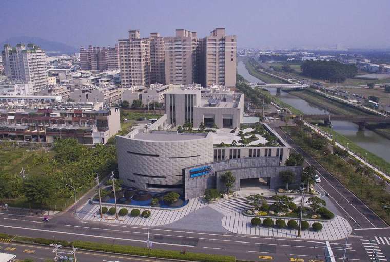 三弧門面: 建築主入口以三道弧線構圖成形,前兩道向外展開、第三道反向收束,猶如雙手歡迎來者,其弧形構造象徵企業開放姿態。主牆面石材 由粗鑿面至波浪狀雕刻層層交錯,搭配挑高立面與植栽圍繞,創造莊嚴且親切的入口氣場。退縮前庭廣場規劃綠意層次與九圓水景,象徵企業家 族延續與財源滾滾,與城市街道綠帶與人行步道相連,成為一座回饋都市的「現代庭埕」。
