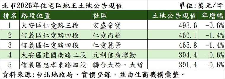 橫貫大安、信義區的仁愛路三至四段,仍是整個北市價值最高昂的門牌,根據數據,位於仁愛路三段的「宏盛帝寶」,2026 年土地公告現值高達每坪 493.6 萬元,位居北市住宅區「地王」,且也是宏盛帝寶自 2012 年以來第 15 度蟬聯冠軍。