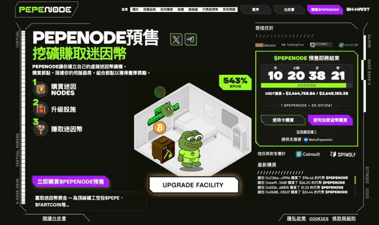 此外,Pepenode 將迷因文化視為運營核心,使參與者在升級與建立挖礦空間的過程中獲得高度沈浸式體驗。這種結構讓 Pepe 宇宙不再只是視覺符號,而成為具備成長曲線的經濟社群。其應用架構兼具趣味性與激勵機制,使 Pepenode 在迷因敘事逐漸疲乏的 2025 找到了新的增長方向。
