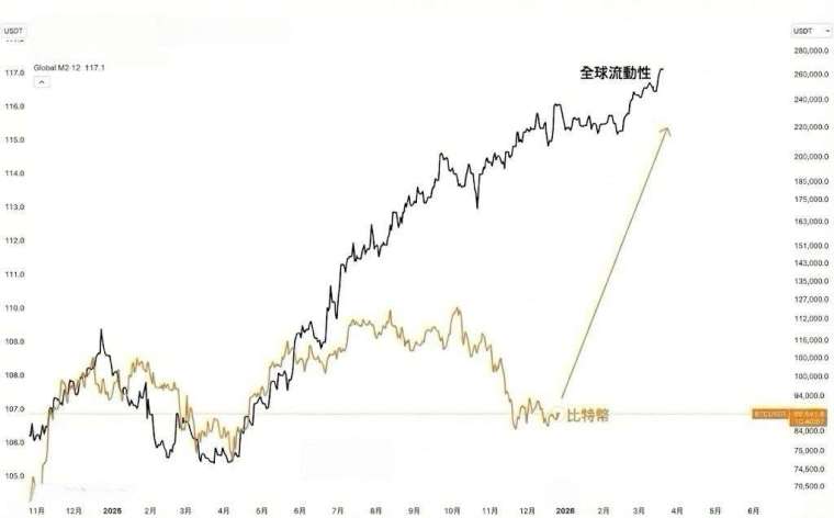 我們把宏觀變數與加密資產放在同一張圖裡,最有價值的不是短線波動,而是資金環境的方向感。這張圖表以黑線代表全球流動性 Global Liquidity,通常可理解為全球 M2 或其加權代理指標的變化軌跡。
