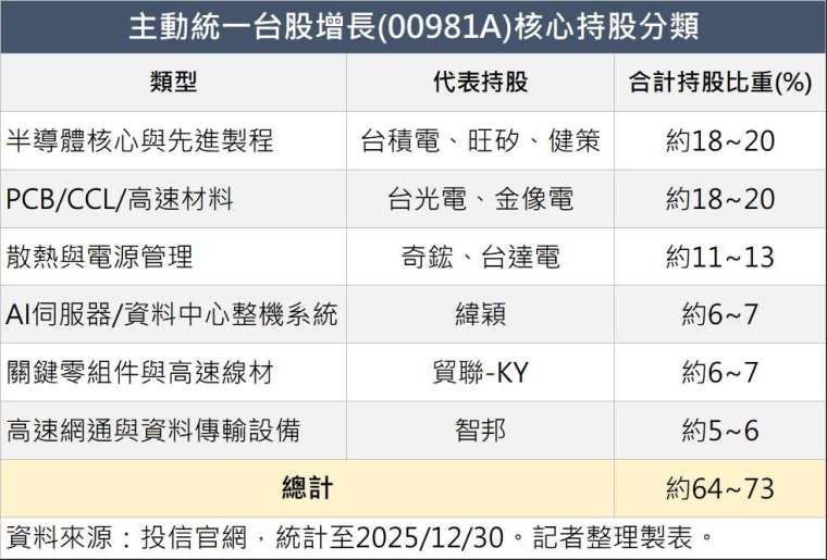 分析投信官網統計至 12/30 的主動統一台股增長 (00981A) 投資組合,有超過六成押寶 AI 族群,高度集中進攻型的個股。同時,有約三成配置在高成長性的次產業,保持投資組合在股市類股輪動時的彈性。統一 00981A 打造「高成長 X 高彈性」的持股艦隊,正是其可以在台股多頭時借力向上、震盪時亦能穩步走高的關鍵。