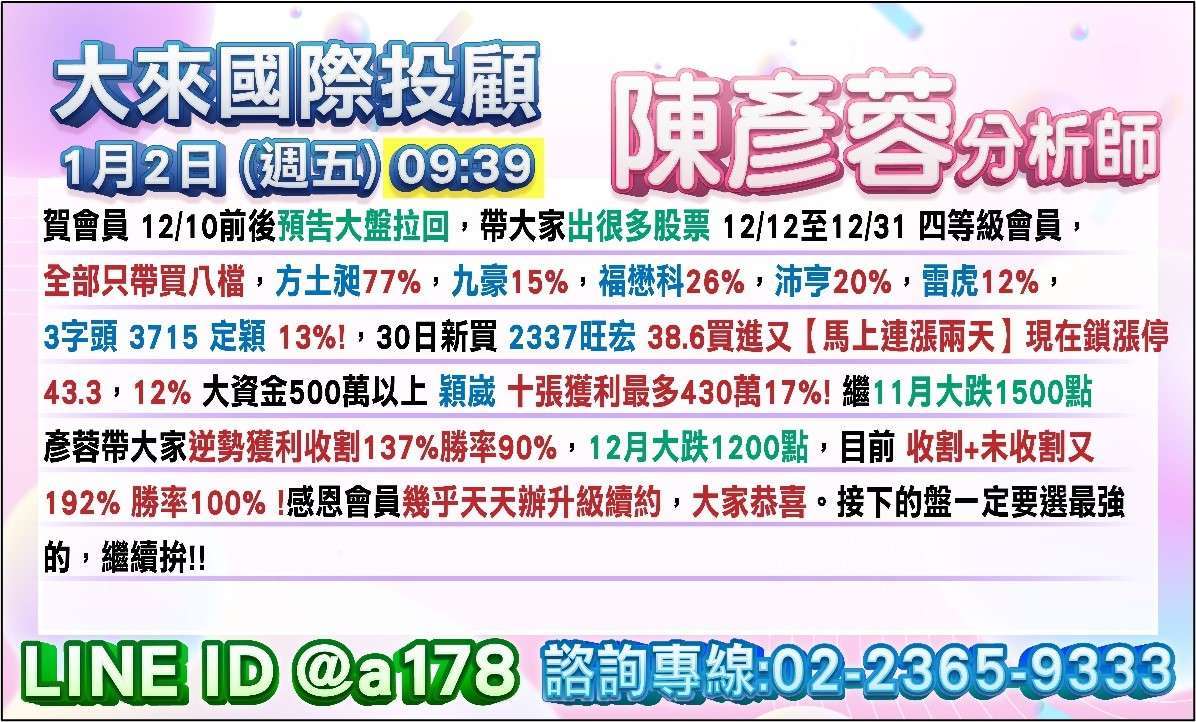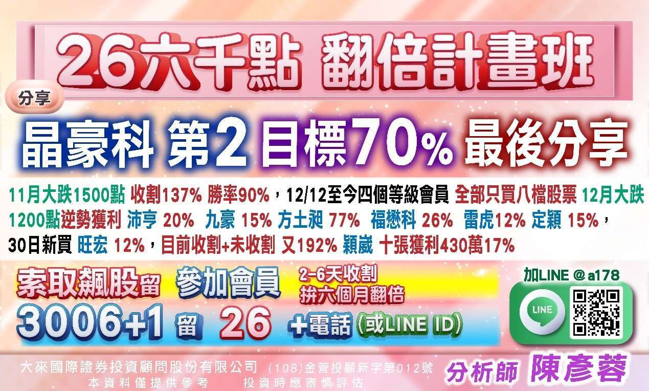 推出,【26 六千點翻倍計畫班】,買六送六,帶買短線 2-6 天急拉,六個月拚翻倍! 參加會員 留 【26 + 電話】,資金 500 萬以上,留言 【500 萬 + 電話】 歡迎點下面 LINE 連結留言給彥蓉 ,我們一起打拼。