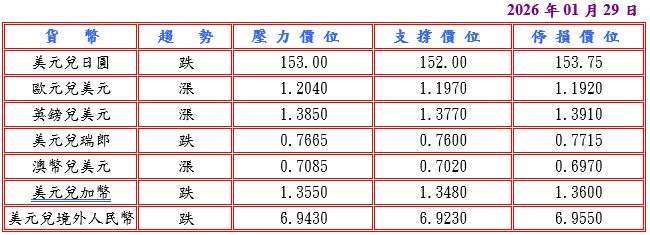 美國消費者信心 1 月降至逾十一年半低點,顯示勞動力市場疲弱和高物價的擔憂不斷加劇,可能使家庭在未來支出上更加謹慎,並據美國總統川普被問及美元近期大幅下跌是否過多時稱,美元價值很好,不希望看到美元進一步貶值,但表示很快宣布美國聯邦準備理事會 (FED) 主席人選,預測新主席上任後利率將下降,而且 FED 的獨立性及美國政府可能再關門的憂慮,週三令美元備受壓力;此外,日本央行 (BOJ) 公布 12 月會議紀錄顯示決策者一致認為有必要繼續提高利率,部分委員則強調日圓疲軟對潛在通貨膨脹及下次加息時機的影響,突顯即使去年 12 月決定上調政策利率至 0.75% 的三十年高位後,政策委員會仍準備繼續推高仍處低位的借貸成本,激勵日圓進一步上漲,美元兌日圓跌至 152.15 低點。