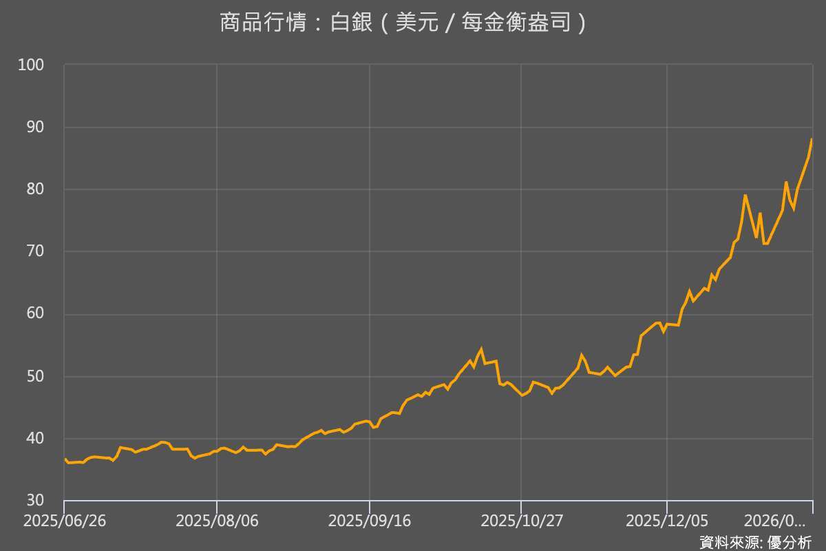 在市場行情方面,白銀價格持續走高,近期一度來到約每盎司91.184美元的歷史高位,市場亦開始討論是否快速挑戰100美元整數關卡。以部分市場報價觀察,白銀價格的強勢表現,已引發投資人對實體金屬供應與避險需求同步升溫的關注。