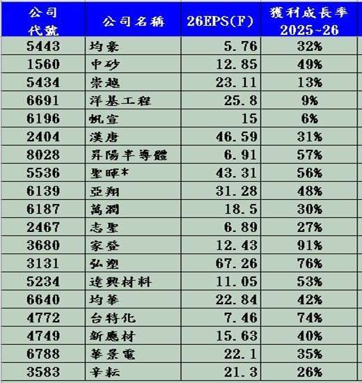 - 漢唐 (2404-TW)、洋基工程 (6691-TW)、巨漢 (6903-TW)、亞翔 (6139-TW)、志聖 (2467-TW)、均豪 (5443-TW):相關設備供應商
