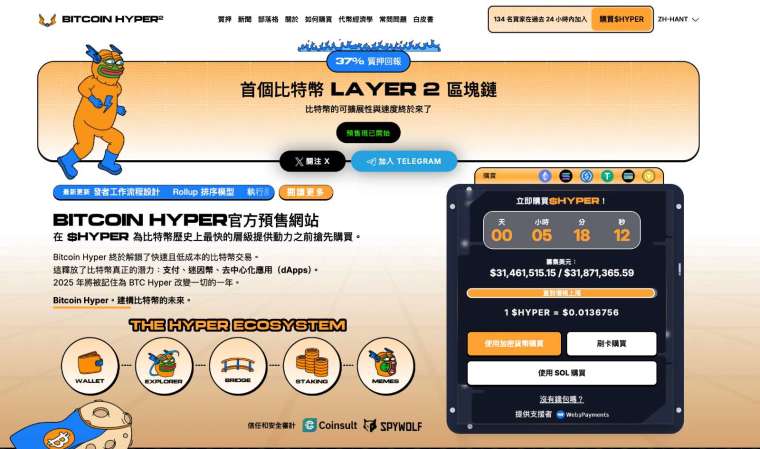 在比特幣震盪整理的背景下,市場另一條熱點轉向比特幣生態的 Layer2 創新。Bitcoin Hyper($HYPER)代幣的預售資料顯示募資規模已達 3140 萬美元,代幣價格進入 0.0136756 美元階段,調價倒數約剩 1 天 6 小時。過去 24 小時新增超過 134 位買家,顯示即使盤面不強,增量資金仍願意進場。更受關注的是單筆大額買入事件,有大型投資者以約 31 萬美元規模進場,強化了市場對短期熱度的解讀,也讓專案在同類預售中更具能見度。