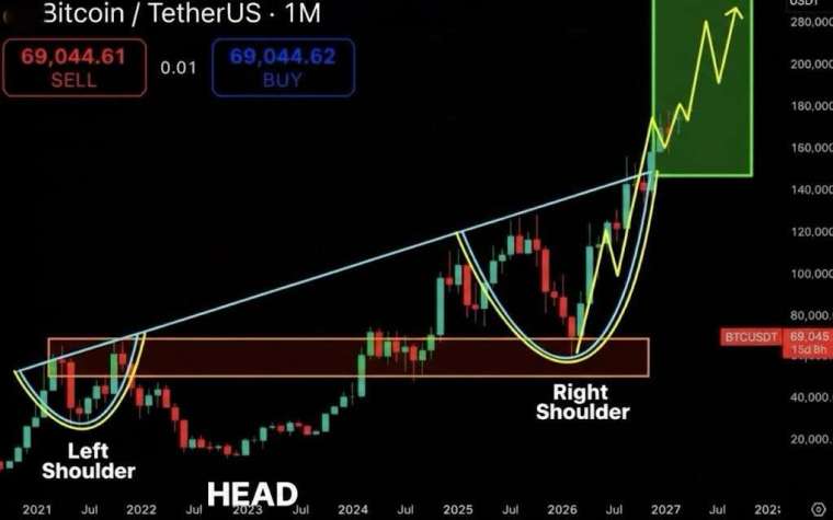 目前價格約 69,044 美元,位於 60,000 至 70,000 美元的關鍵支撐帶內。這個區間對右肩是否成立具有決定性意義,因為只要月線能穩定守在此帶上方,右肩就具備延續的條件。與此同時,頸線被視為多空力量的最終壓力帶,位置大約落在 140,000 至 160,000 美元之間,且會隨時間推移呈現動態變化。一旦出現月線實體有效突破,形態在技術上才算被確認,市場也更可能從觀望轉向追隨趨勢。