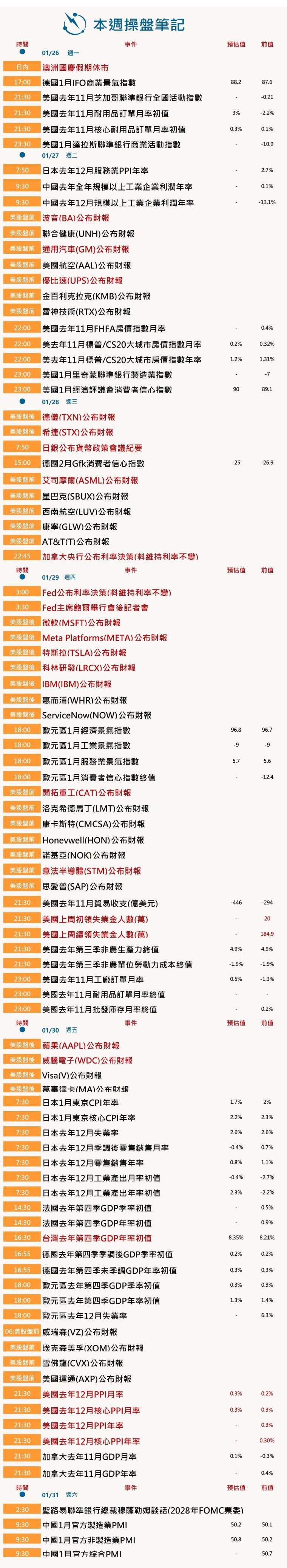 除了美國,全球金融市場本周也迎來多項重要事件。加拿大、瑞典、新加坡、巴西與南非等國央行將陸續公布利率決策;日本則將釋出去年 12 月升息會議的紀錄,市場關注日圓與日本公債的後續波動。