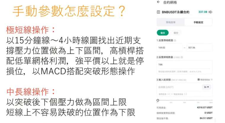 價格區間: 建議觀察技術走勢,將「支撐位」設為下限,「壓力位」設為上限。區間越窄,套利頻率越高,但突破風險也越大。
