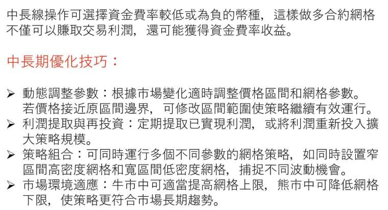 - 市場環境適應:牛市中可適當提高網格上限,熊市中可降低網格下限,使策略更符合市場長期趨勢。