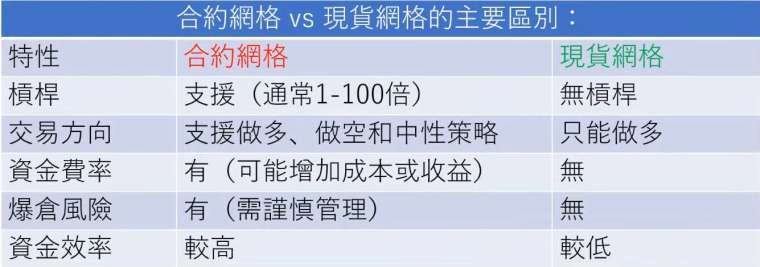 在操作之前,你必須先釐清兩者的本質區別。合約網格並非只是「加了槓桿的現貨」,其風險結構與成本截然不同。