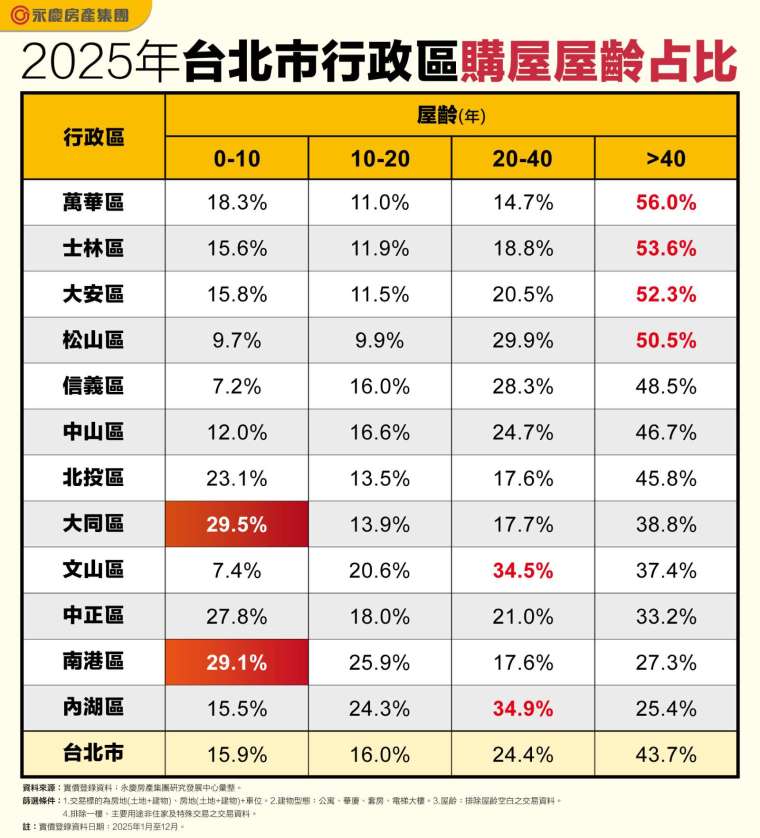 內政部不動產交易平台房屋稅籍住宅類平均屋齡顯示,2025 年第三季台北市住宅平均屋齡為 39 年,屋齡超過 40 年占比更達到 57.07%,至於不同屋齡住宅交易情形,房仲業者統計台北市 12 行政區不同屋齡區間的交易占比,其中萬華區、士林區、大安區與松山區,屋齡超過 40 年住宅交易占比就超過 50%。