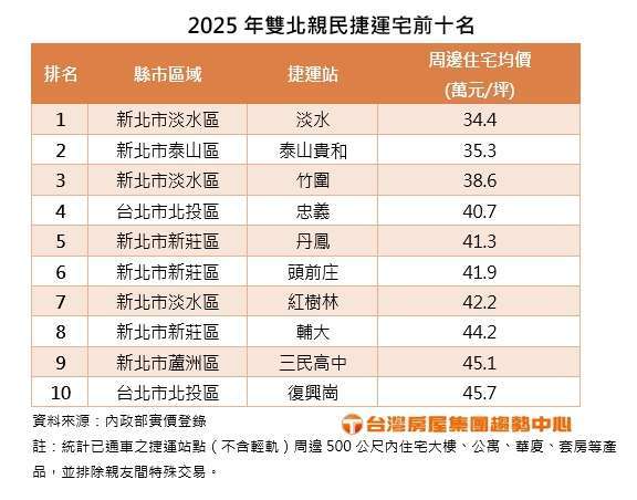 雙北捷運路線越來越密,也越來越多人沿捷運而居,房仲業者統計實價登錄,2025 年雙北市各捷運站周邊 500 公尺住宅單價最便宜的前 10 名站點,由新北淡水站平均 34.4 萬元,奪得房價最親民站區。其次是泰山貴和站以 35.3 萬元位居第二,竹圍站第三名,前十名中僅 3 個站房價平均仍落在 3 字頭,其餘北投、新莊、蘆洲各站,都要 4 字頭起跳。