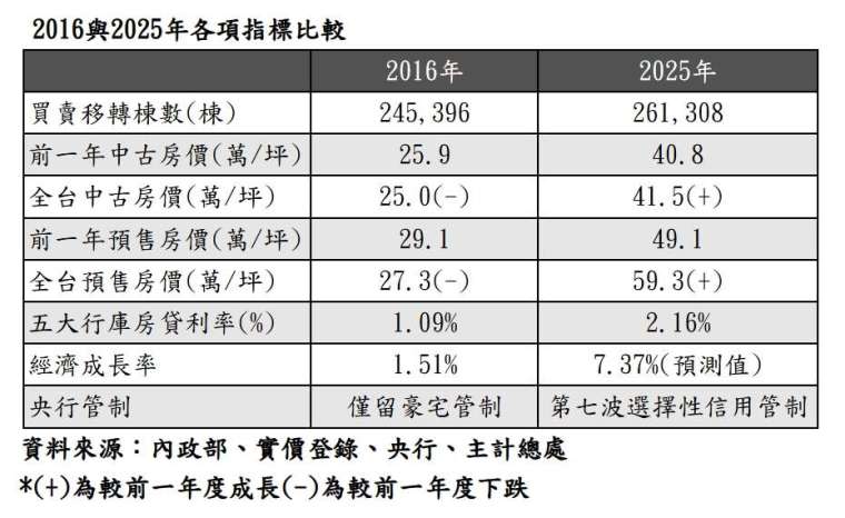2025 年全台房市陷入低谷,外界也劍指台灣央行選擇性信用管制是房市復甦與否的重要關鍵,不過目前的經濟表現和 2016 年有很大不同,有幾個訊號值得留意,房仲業者從價量、利率、經濟成長等指標比較發現,雖然成交量一樣維持低檔,但 2025 年在經濟成長支撐下,房市呈現價量背離。
